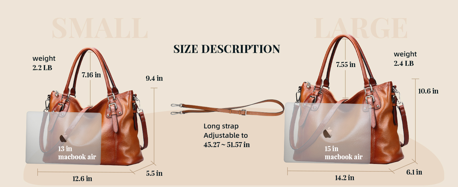 Different Size: The small hobo purse measures (L)12.6 x (H)9.4x (W)5.5in,and the weight is 2.2pounds; the large size is (L)14.2 x (H)10.6x (W)6.1in, weight 2.4LB. Please check the size before purchasing.